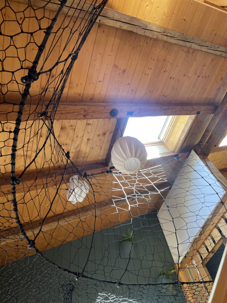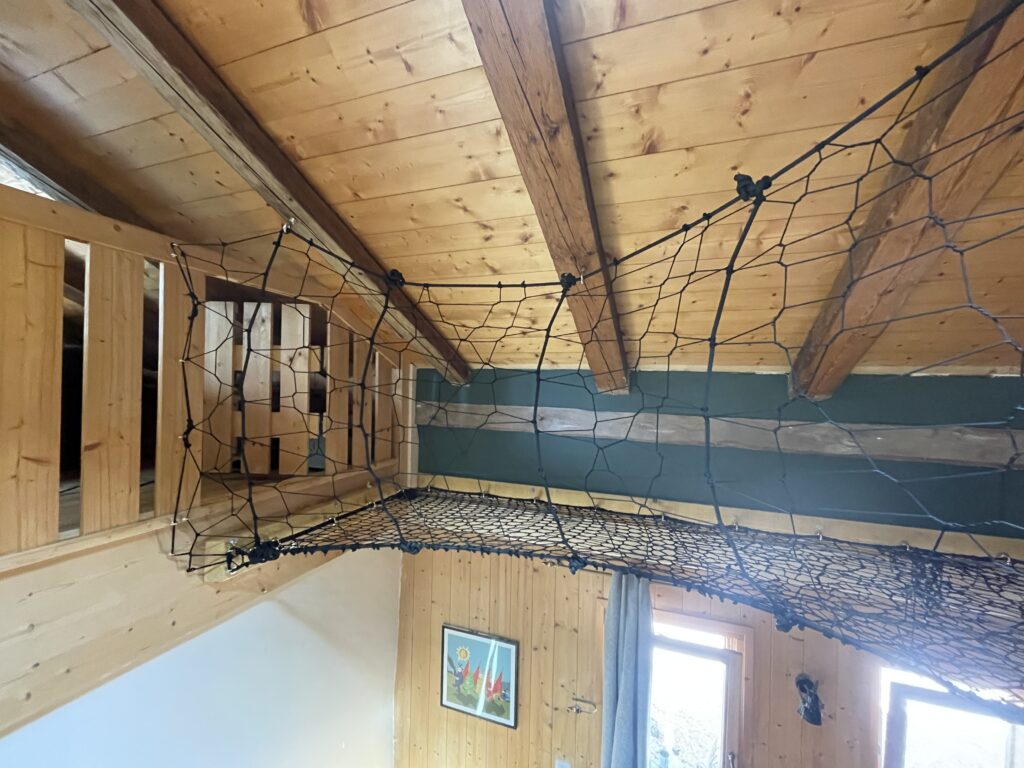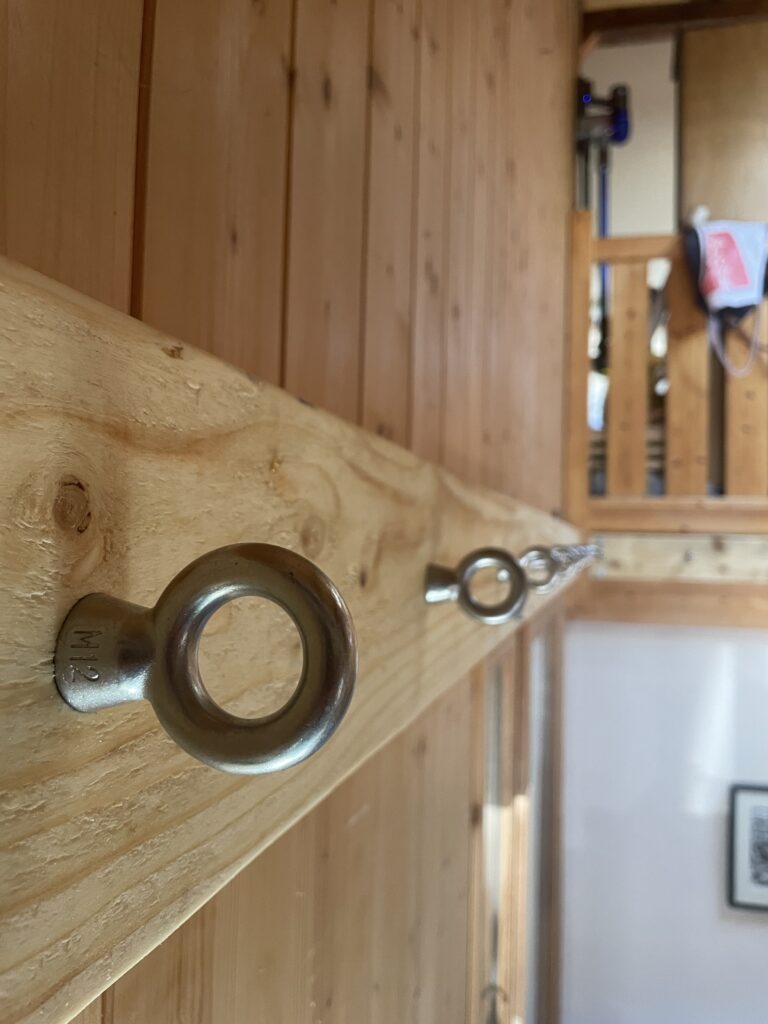 2. Following discussions with a certified local carpenter, measures were taken to further reinforce the wooden walls. Our carpentry partner installed large solid wood beams to the structure of the house, and over 40 individual 120mm stainless steel eye bolts to help secure the outer perimiter rope and ensure the integrity of the base structure.