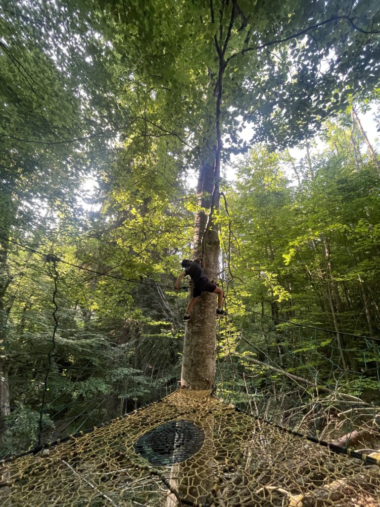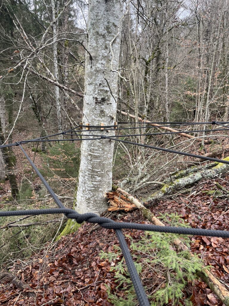1. The client had a great patch of woodland, so after choosing the perfect spot, we started with the tree protector wood blocks (to ensure the tree continues to grow healthily) and then set up the perimiter with static climbing rope at high tension