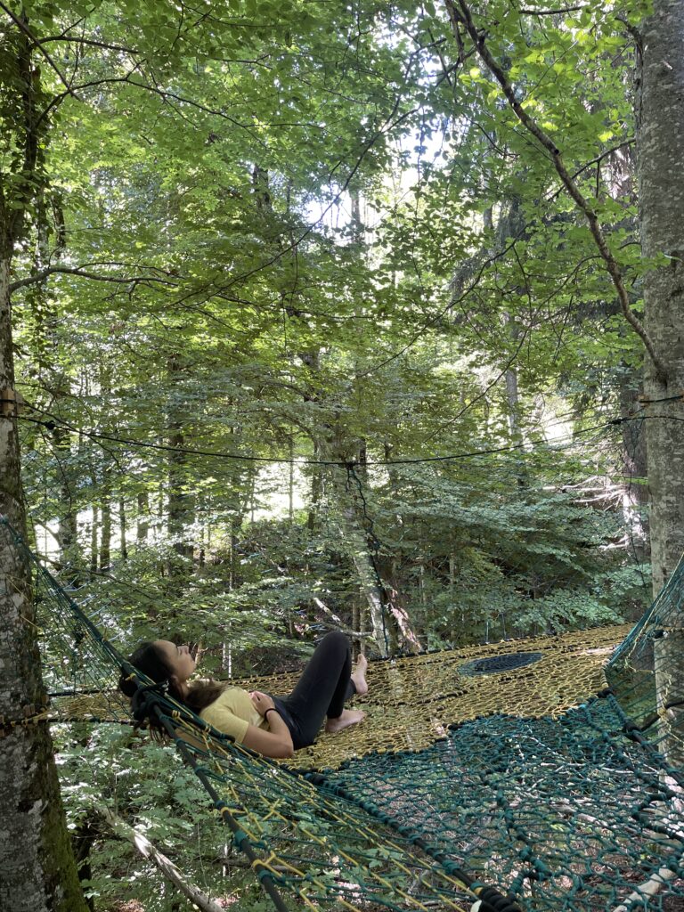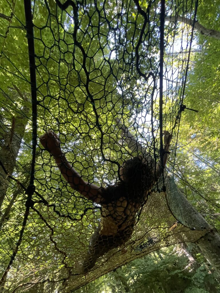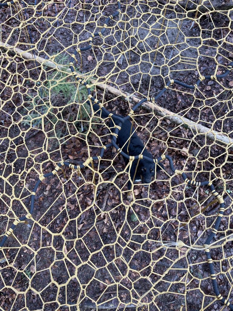 3. The overall net was between three trees, so we had a walk on section which then expanded to the main wide part of the net – this gave it an almost spaceship like appearence. 4km of paracord was used for this and we wove in drink holders and a few special pieces and patterns that the client had requested